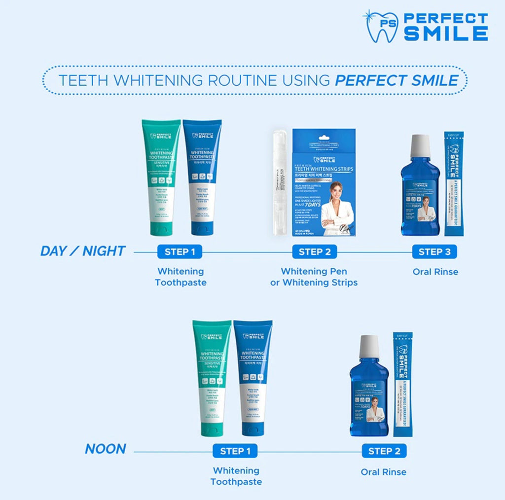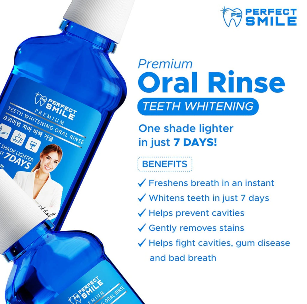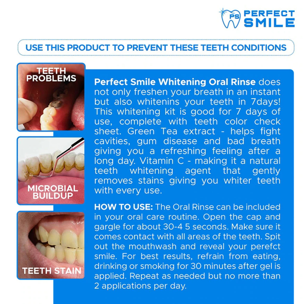 - Perfect Smile Premium Teeth Whitening Oral Rinse does not only freshen your breath in an instant, but also whitens your teeth in just 7days!