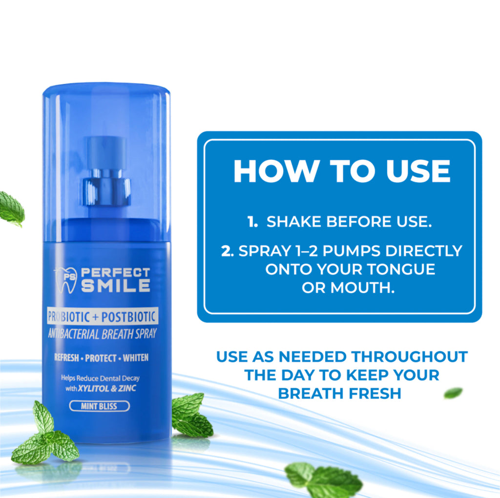 Achieve fresh, confident breath with Perfect Smile Probiotic & Prebiotic Antibacterial Breath Spray. Freshen your breath and support oral health with this alcohol-free, sugar-free spray. Powered by Probiotics, Prebiotics, Zinc, and Xylitol, it helps combat bad breath, reduce dental decay, and promote a balanced oral microbiome. Perfect for on-the-go freshness!